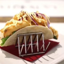 Tortita de trigo, espinacas, calamares fritos, cebolla, mahonesa picante y lima.
