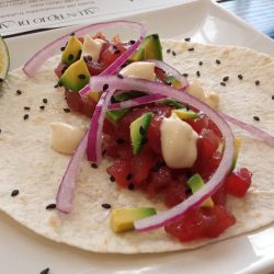 Torta de trigo, guacamole, dados de tomate, tartar de atún, cebolla morada, mahonesa de sriracha y lima.