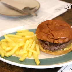 Carne de vaca 100% Retinta, guacamole, queso de cabra, cebolla caramelizada en pan brioche acompañadas de patatas fritas