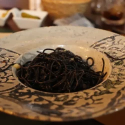 Pasta fresca negra cocida al momento, aceite aove, ajo, gambones y guindillas picantes