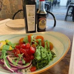 Lechuga, aguacate, nueces, dados de remolacha, bola de queso burrata y una vinagreta de aceite, mostaza de Dijon con miel