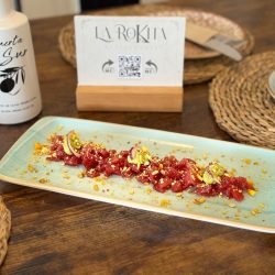 Tartar de gambas roja, ventresca y descargamento de atún acompañado de perlas de lima, wasabi, soja y aove